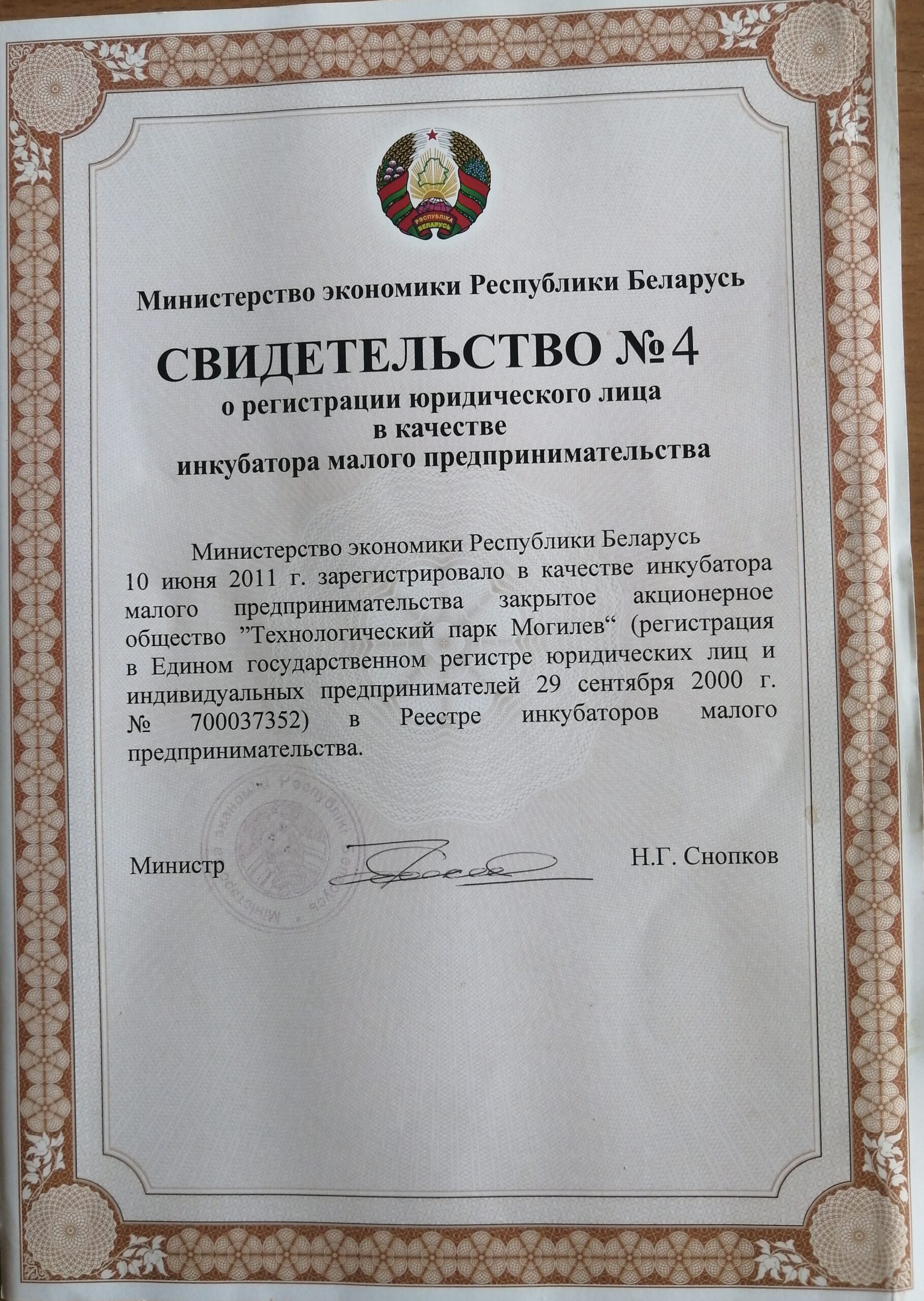После вступления в силу Постановления Совета Министров Республики Беларусь от 30.12.2010 N 1911 «О мерах по реализации Закона Республики Беларусь «О поддержке малого и среднего предпринимательства» Министерством экономики было выдано Свидетельство № 4 о регистрации юридического лица в качестве инкубатора малого предпринимательства.