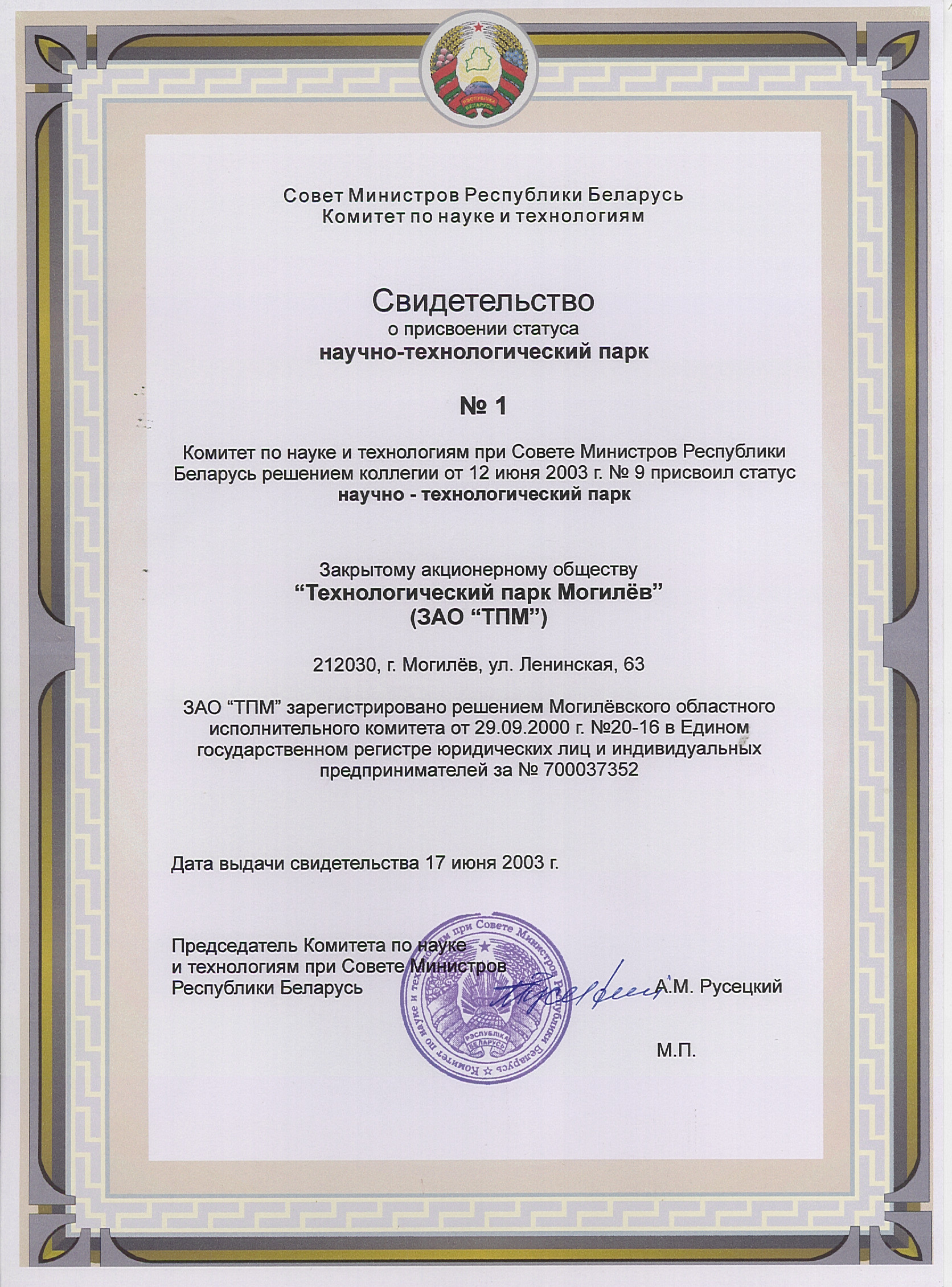 29 ноября 1999 года Государственным комитетом по науке и технологиям был присвоен официальный статус научно-технологического парка в соответствии с постановлением Совета Министров Республики Беларусь от 31 июля 1997 г. № 998 «Об утверждении положения о научно-технологическом парке» и приказом Государственного комитета по науке и технологиям Республики Беларусь от 27.10.1997 N 95 «Об утверждении Порядка отнесения субъектов хозяйствования к научно-технологическим паркам».