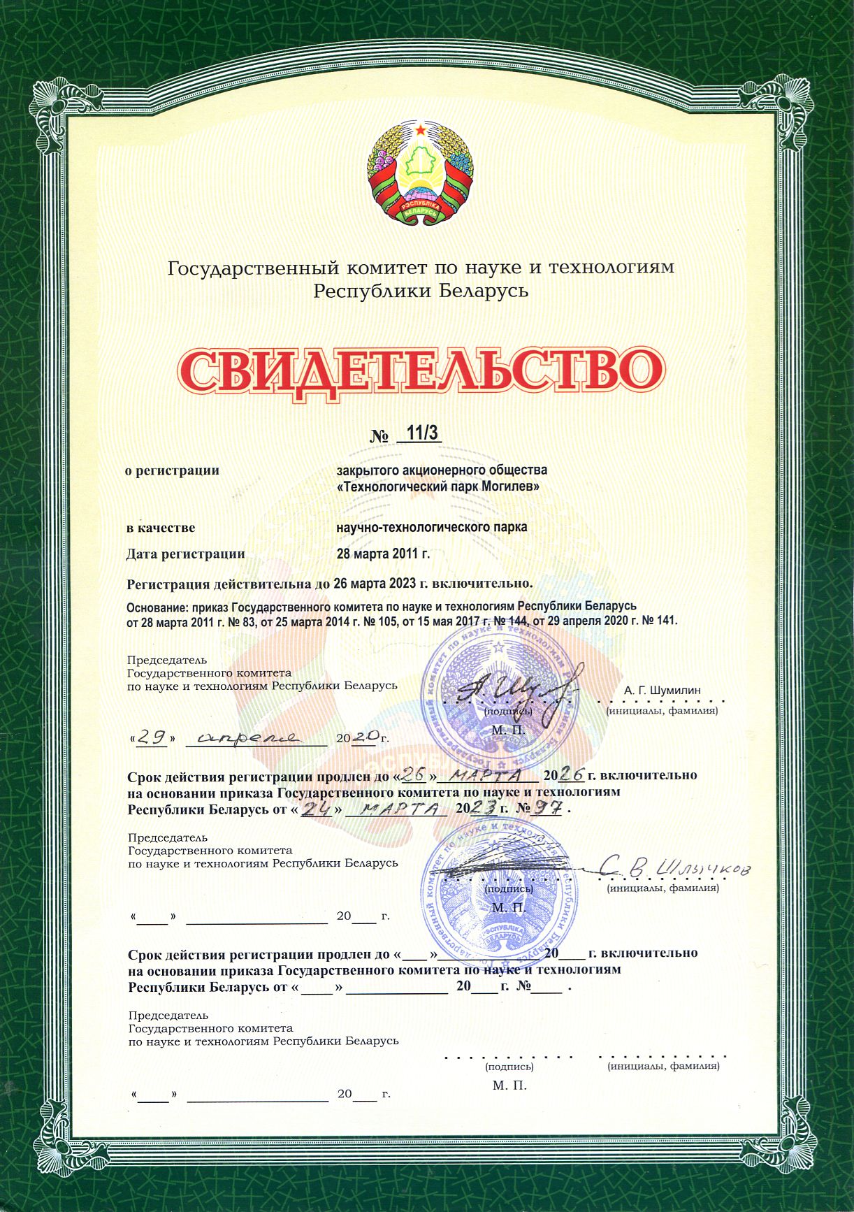 После изменения законодательства ЗАО «ТПМ» было зарегистрировано в качестве научно-технологического парка Приказом Государственного комитета по науке и технологиям Республики Беларусь от 28 марта 2011 года № 83. Регистрация действительна до 26 марта 2026 года (Приказы Государственного комитета по науке и технологиям Республики Беларусь от 28 марта 2011 г. № 83, от 25 марта 2014 г. № 105, от 15 мая 2017 г. № 144 и от 29 апреля 2020 г. № 141, № 97 от 24 марта 2023 г.).